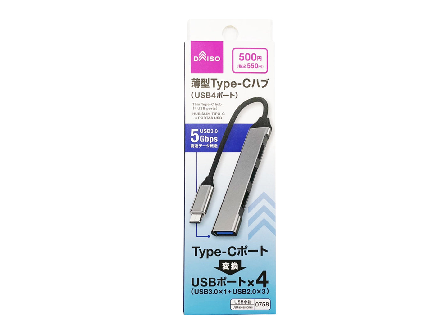 以前からUSB2.0規格のUSBハブはダイソーやセリアなどでも販売されているのですが、100円ショップでUSB3.0規格のUSBハブが出るのは今回が初だと思います。家電量販店やAmazonでマトモなメーカーのUSB3.0ハブを買おうとすると、安いのでも2,000円くらいするので、この550円というプライスは魅力的です。