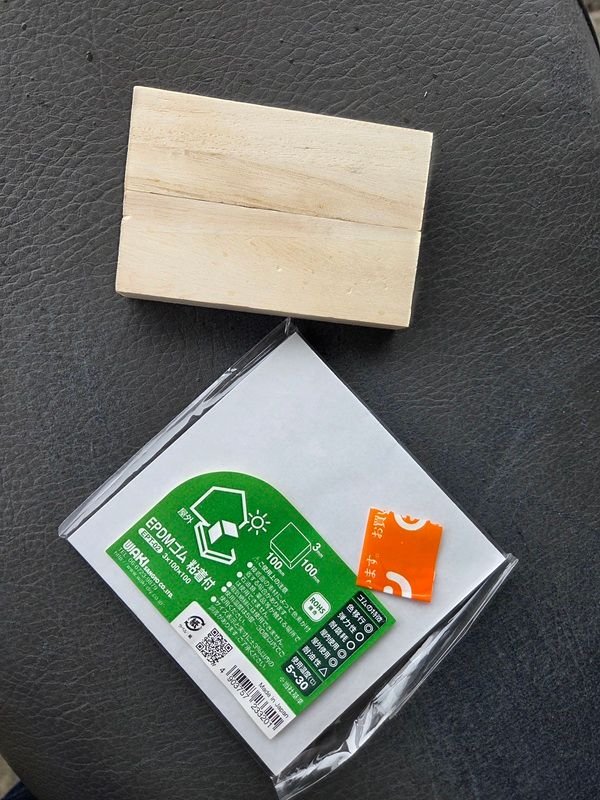 ダイソーで売られている角材を4個組にして、その上から耐候性に優れたEPDMゴムを貼りました。振動低減のほか、OZMO ACTION側のキズを防ぐ目的も兼ねています。このゴムはコーナンPROで200円ちょっとで手に入るもので、劣化してきたら随時交換できます。