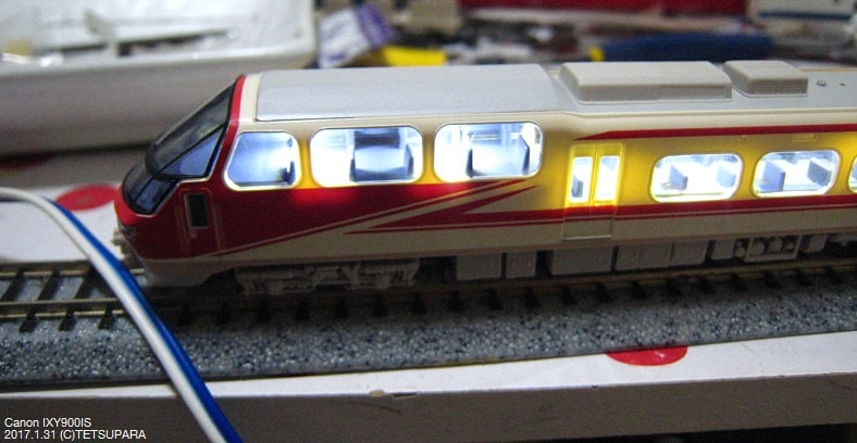 パノスパの展望席部分は構造上TOMIXなどの市販室内灯がつかずせっかくの展望席に光が行かないのですが、テープLEDなら柔らかいので展望席部分まで伸ばせルンです。
