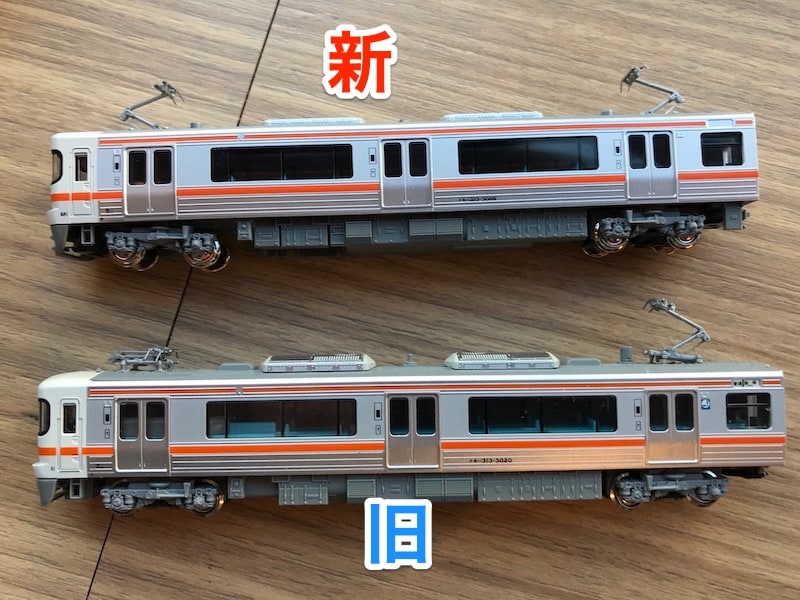 旧製品と比較します。ボディの造形は最近の313系のものと同じです。床下はよりシャープになって良くなっています。旧製品にはなかったクモハの車端部の床下パーツも追加されました。