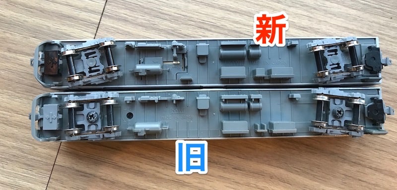 床下は最近のKATO製品でデフォルトとなったピン留め台車、半トレーラーの新動力へ切り替わっています。CP(?)の位置がずれているのと1箇所表現が追加されているのがわかります。