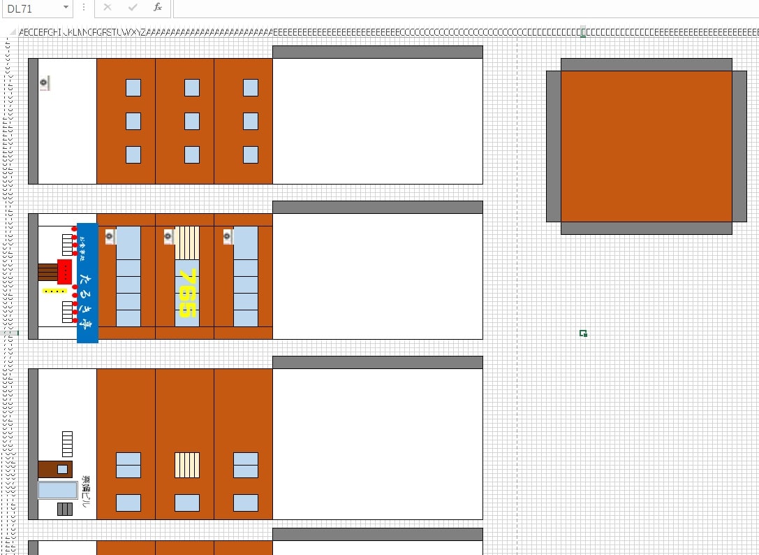 前面の配置はだいたい再現できました。室外機だけでなく1階のたるき亭の提灯などもExcel上で作ってあります。