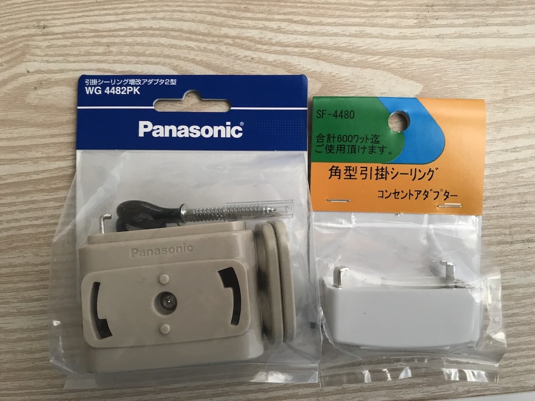 このパナソニックの引掛シーリング増改アダプター2型とコンセントアダプタを2個使って、コンセントを2口設けることにしました。