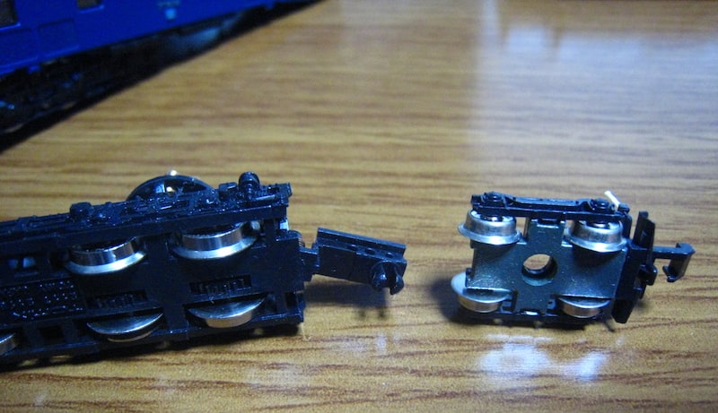 アーノルドカプラーを取り外し、KATOカプラーNを以前イトケンさんのEF81レインボーに施工したのと同じ方法で、ゴム系接着剤で固定します。車輪が左右に分離されている構造がよく分かります。