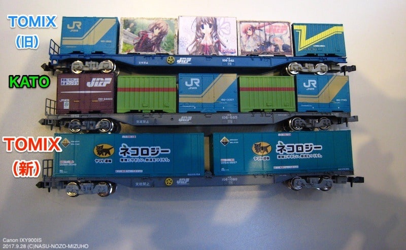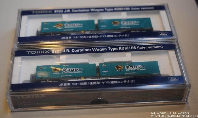 [link url=”http://www.tomytec.co.jp/tomix/products/n/8723.html” title=”JR貨車 コキ106形(後期型・ヤマト運輸コンテナ付)|鉄道模型 TOMIX 公式サイト|株式会社トミーテック” content=”コキ106形は1997年より製造された海上コンテナ対応車両です。製造途中から車体色がスカイブルーからグレーに変更され、スカイブルーの車両も検査時にグレーに変更されました。コキ106形のうち後期型は車体側面に手ブレーキ緊解表示装置が追加されました。ヤマト運輸ロゴのUV51Aコンテナは30フィートの通風コンテナです。”]
