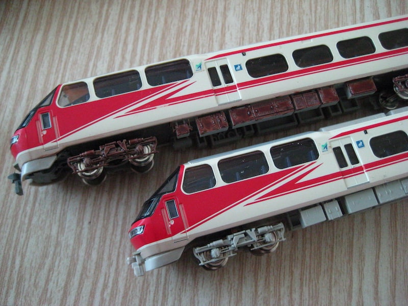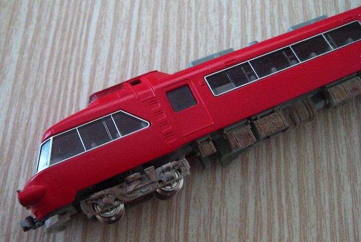 鉄道模型の車両製品は原則ウェザリングをしないことになっていて、床下も新製時のようなピカピカな状態で再現されています。とくに名鉄のような新製時の床下がグレーの場合、”なんとなく”違和感を感じてしまうのです(笑) だって、大抵の場合は錆びて汚れた状態ですからw